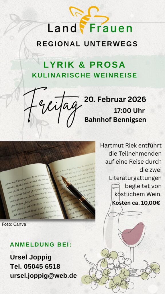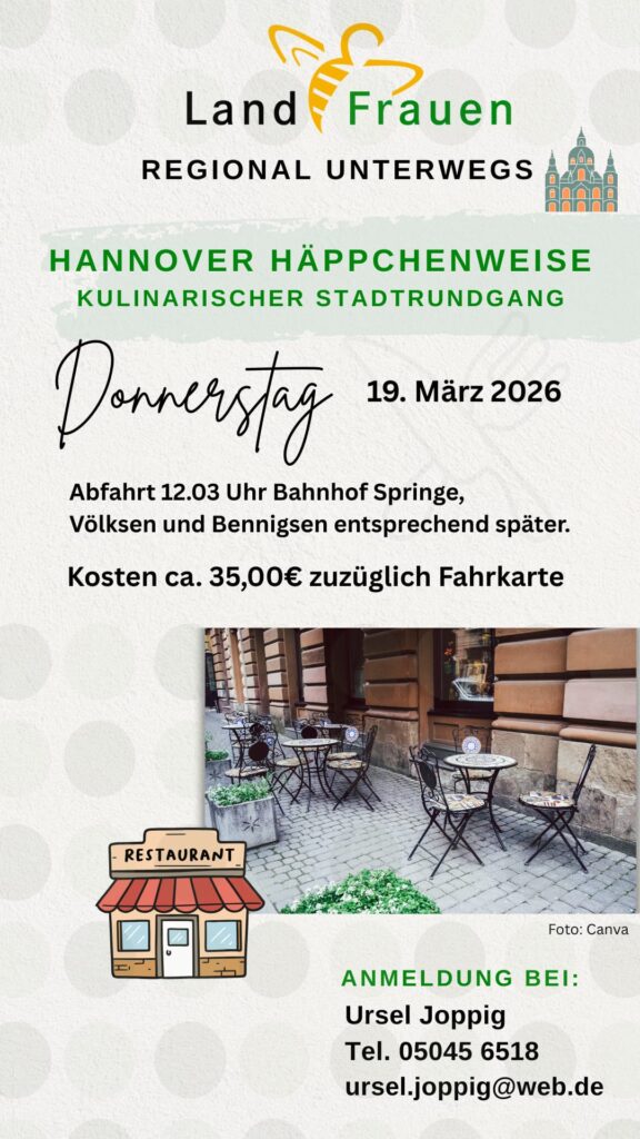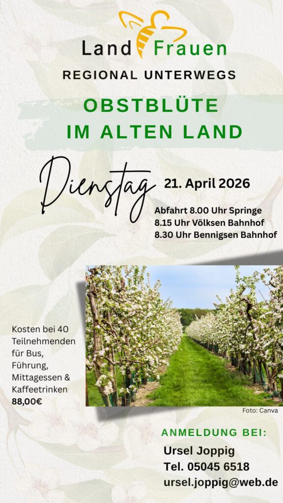 LandFrauen aus Altenhagen I, Alvesrode, Bennigsen- Lüdersen, Brullsen, Flegessen, Hachmühlen, Mittelrode, Springe und Völksen begrüßen alle Frauen auf dem Land „LandFrauen“ und laden herzlich ein im harmonischen Miteinander all unsere Veranstaltungen mitzuerleben.