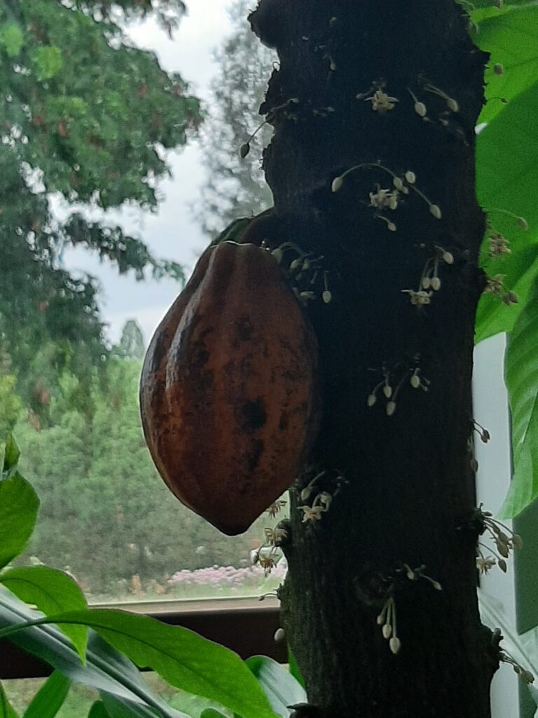 reife Kakaofrucht und Blüten